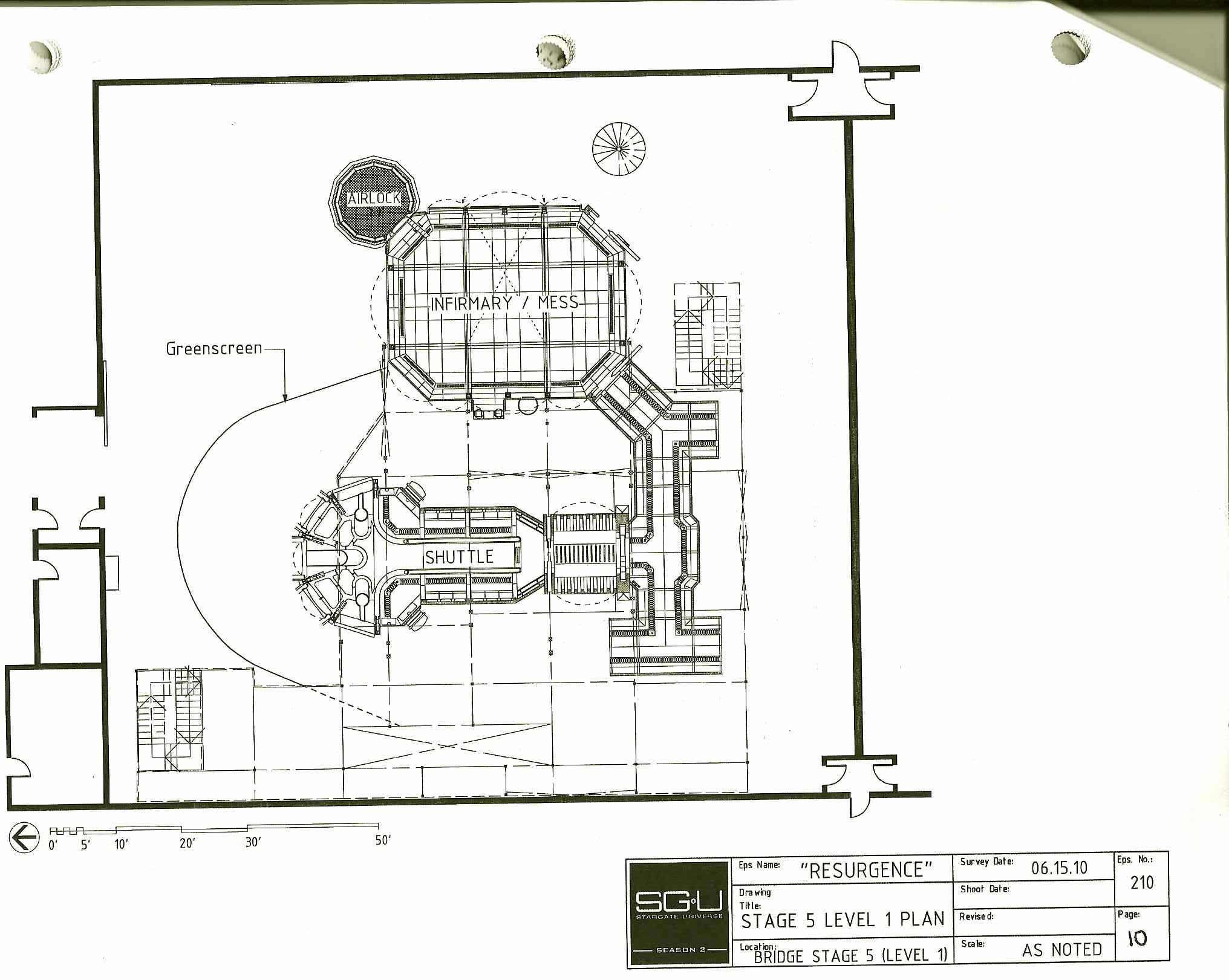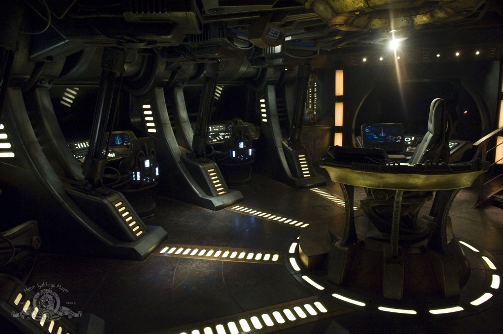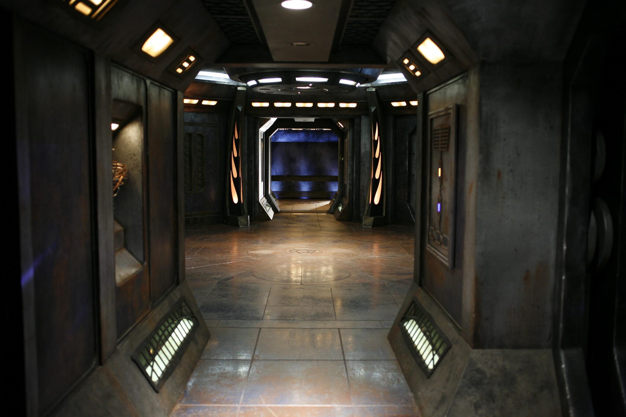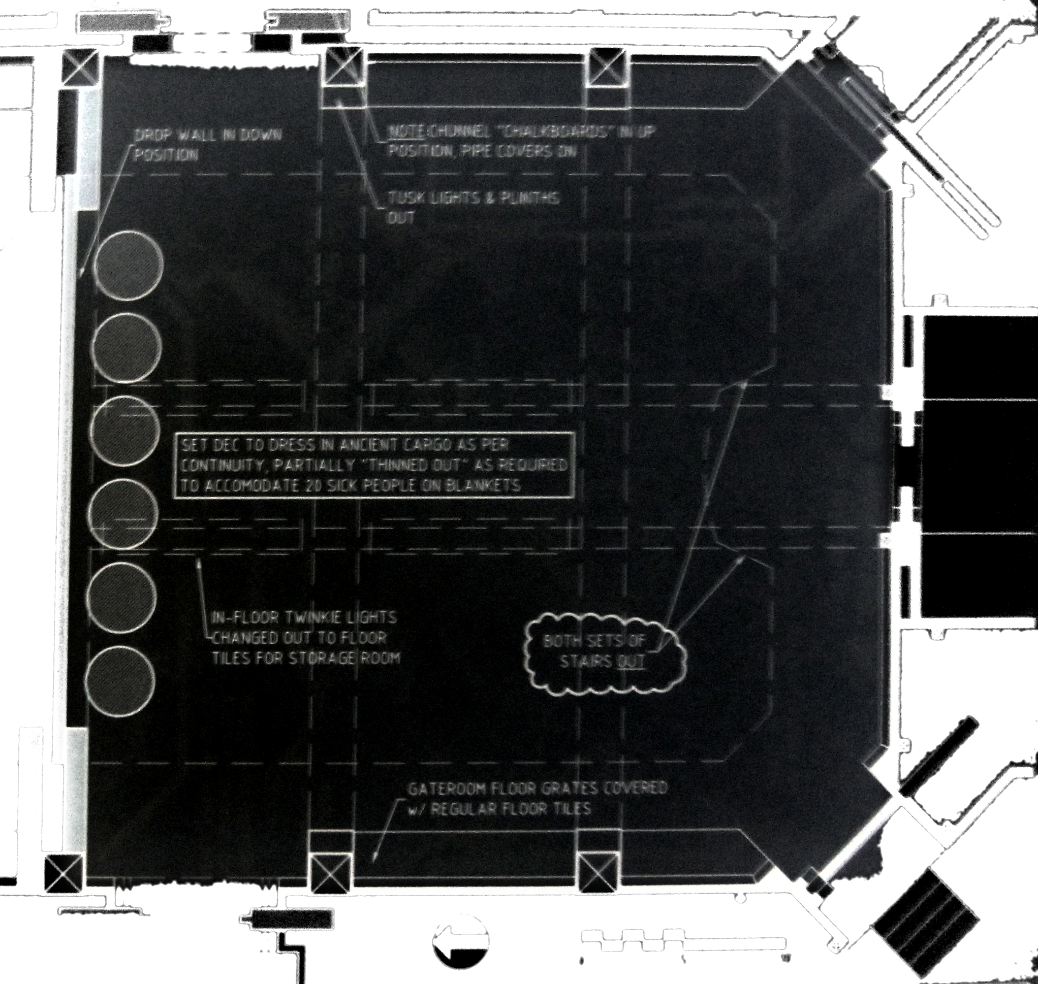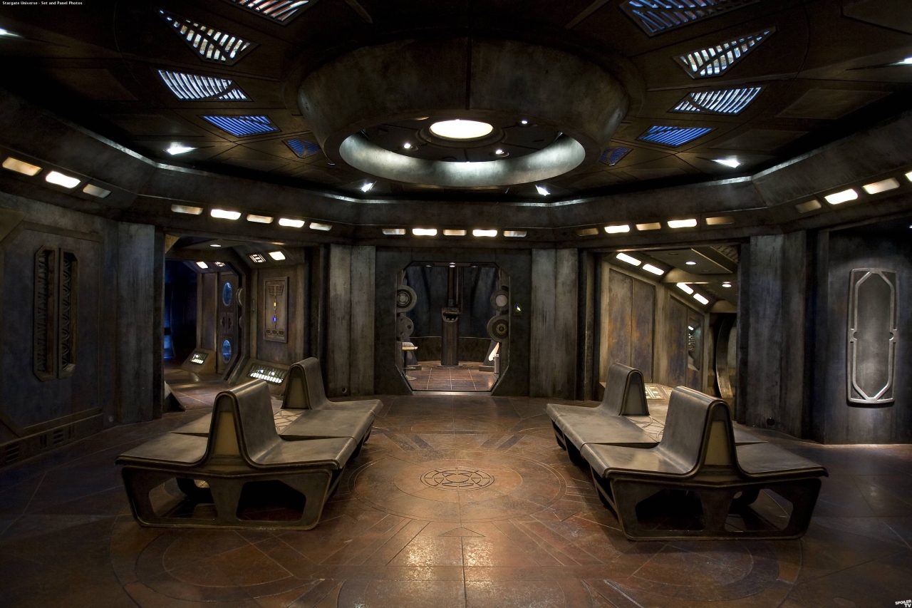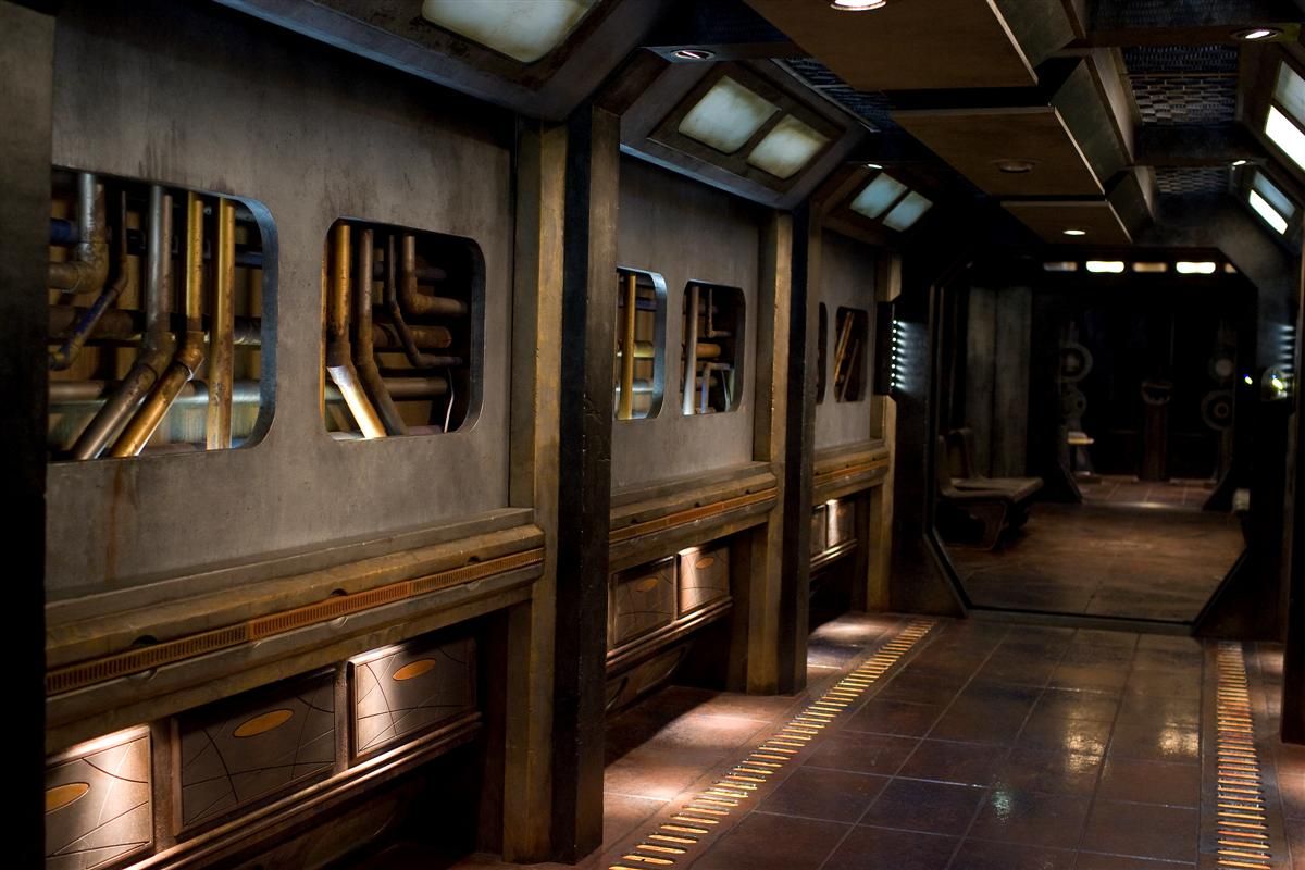 James Robbins, produkční designér, se začal zabývat koncepty „na podzim minulého roku“. Prvním úkolem bylo vymyslet koncept studia a organizační strukturu pro kulisami. Loď představuje velmi starou historickou strukturu vyrobenou z oceli, s řadou sloupů a nosníků. Po třech až čtyřech týdnech malování kulis bylo přidáno betonování, aby se ocelové součásti dobře podepřely. Loď je obrovská, s kilometry chodeb. Studio samotné má na délku 45,7 metrů, přičemž místnost s bránou a přilehlé chodby zabírají na délku asi 42,6 metrů. Celý prostor studia tak byl využit k vytvoření dojmu velikosti. Různé části chodeb lze různě konfigurovat, což umožňuje vytvořit 20 až 30 různých lokací na jednom natáčecím místě. Sloupy, světla, konzole a další dekorace lze snadno vyměňovat a kombinovat. Kolem místnosti s bránou bylo nainstalováno asi 30 mechanizovaných dveří. Oddělení speciálních efektů si dokonce objednalo motory pro dveře až z Japonska, aby zajistilo správný dojem při jejich otevírání.