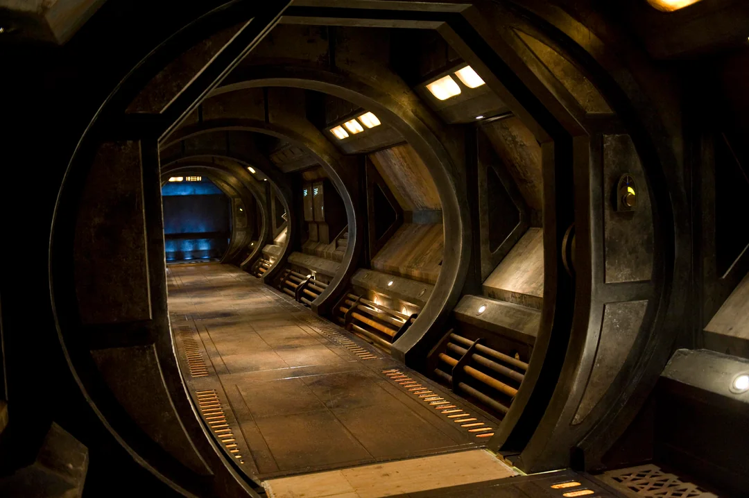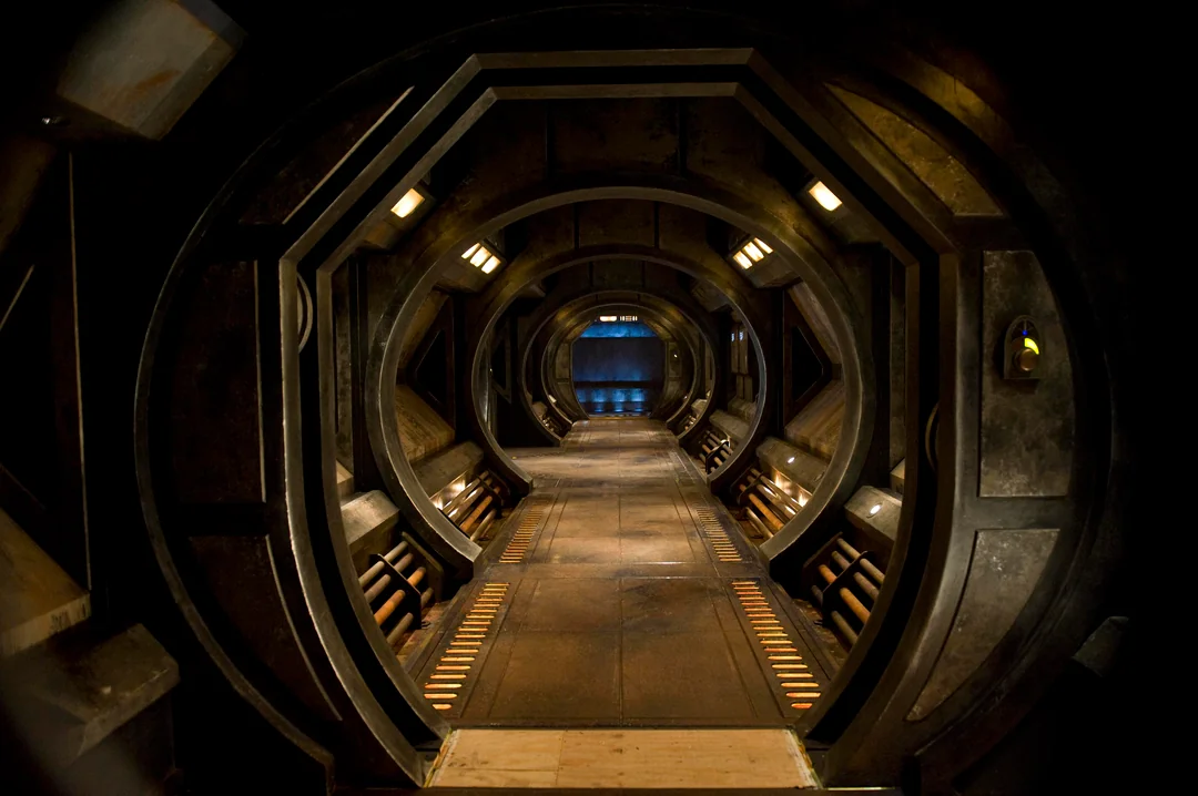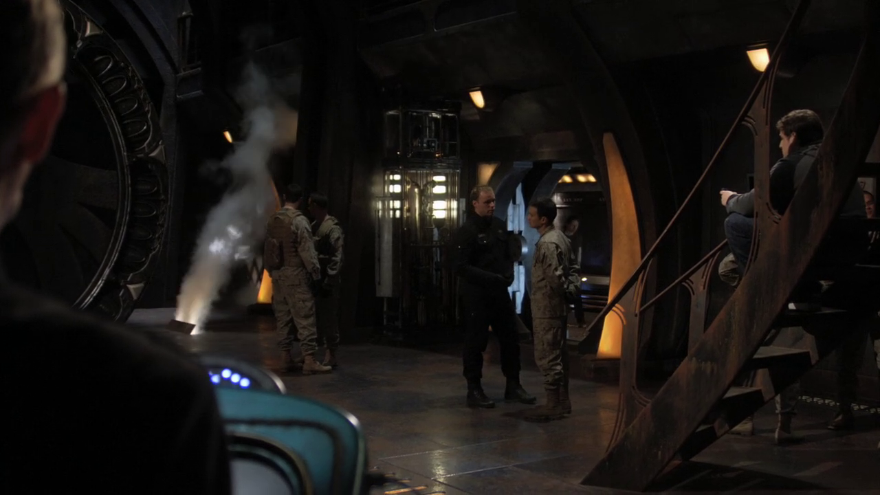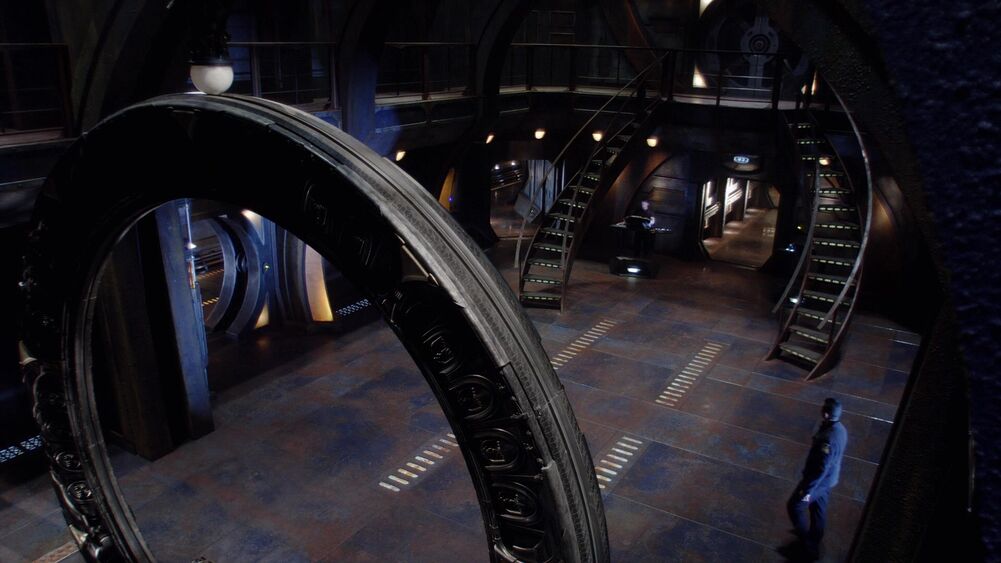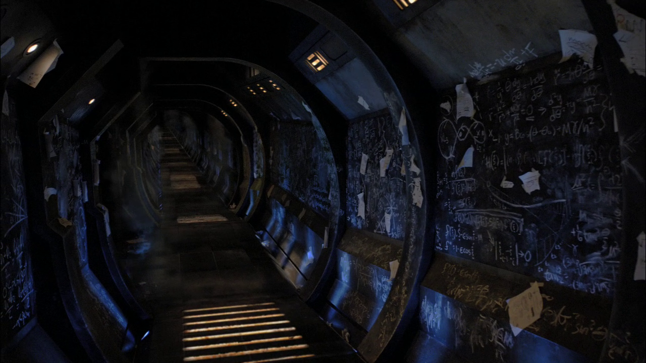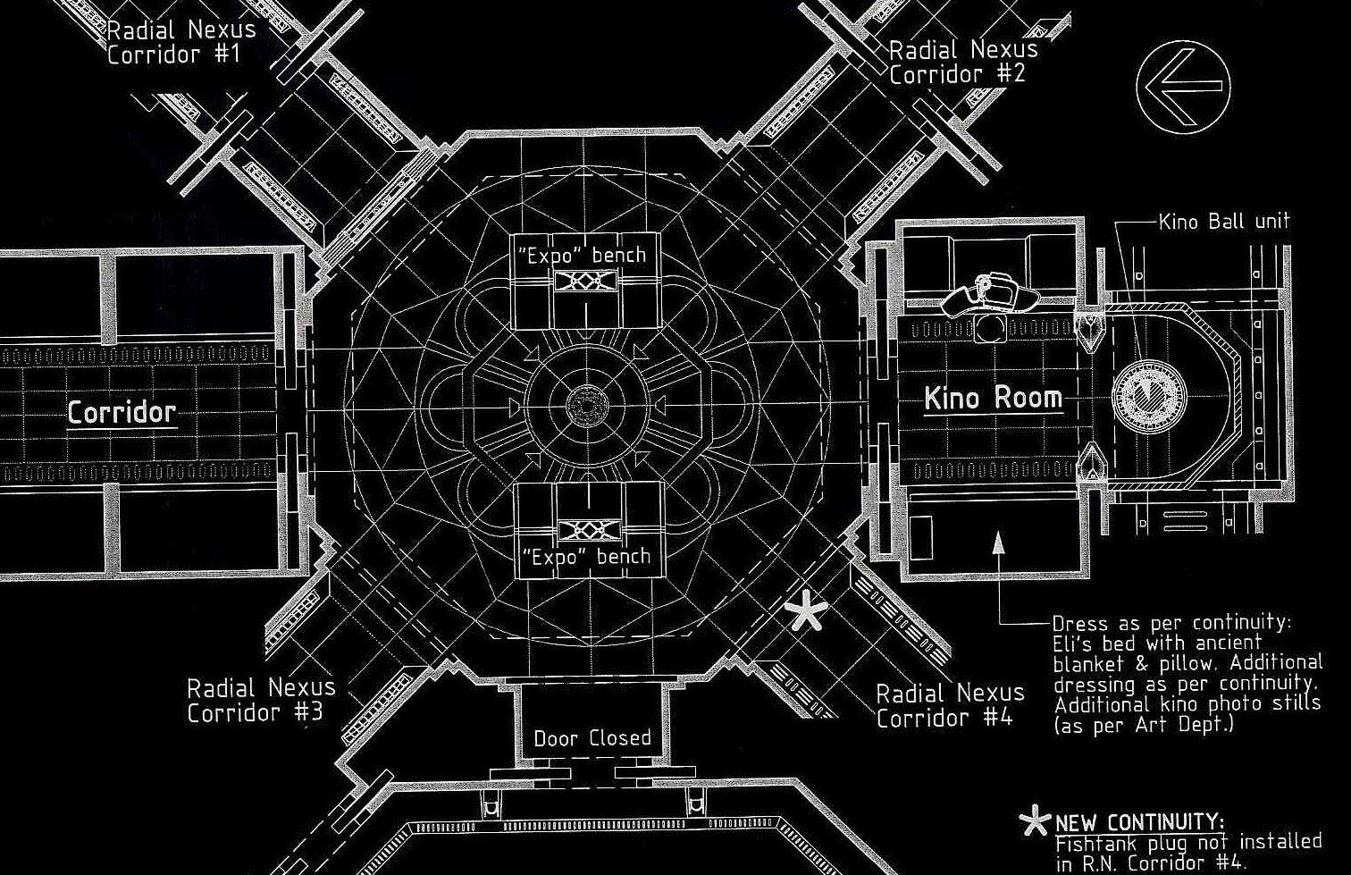 Chodba mezi místností s bránou a místností typu Nexus je skvělým příkladem multifunkčnosti. Tato část lodi slouží nejen jako sklad skafandrů, ale také jako chodba s nabíjecí stanicí nebo jako chodba před místností s křeslem. Podobně místnost s bránou není jen univerzálním skladem, ale slouží také jako Brodyho bar a dokonce jako tělocvična. Stačí jen odsunout dvoje ocelové točité schody, které dohromady váží asi tři tuny, a lze vytvořit další prostor. Krom ocelových a betonových části byly kulisy postaveny ze dřeva a nabarveny tak, aby svou texturou připomínaly kov. Součástí zadání bylo integrovat do kulis dostatečné množství světel tak, aby se minimalizovalo použití dalšího osvětlení při natáčení. Světla jsou umístěna po celém prostoru, s častým využitím světel pod úhlem 45° v chodbách. Dalším typem světel jsou tzv. „Tusk“ světla.